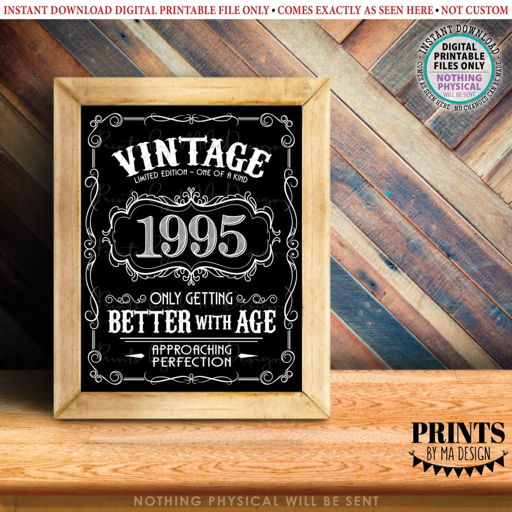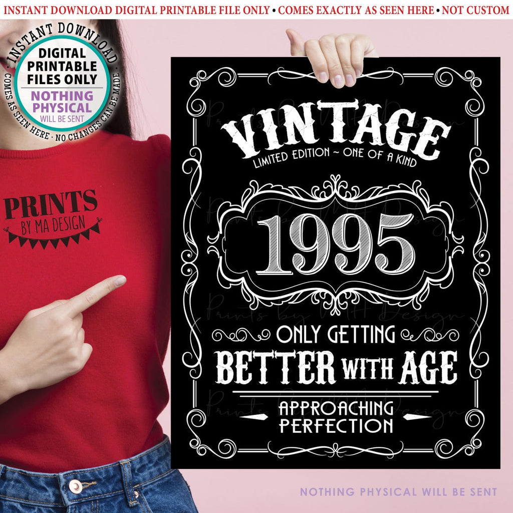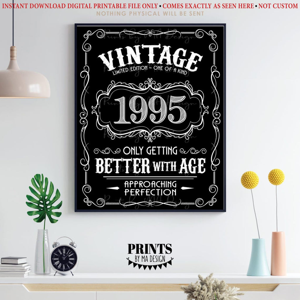 Better with Age 1995 Vintage Birthday Gift printable black & white sign/poster. Makes an excellent gift or party decoration!
